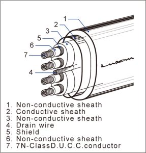 | Drain wire | Oxygen-free copper (OFC) wire, Φ0.08mm x 30pcs |